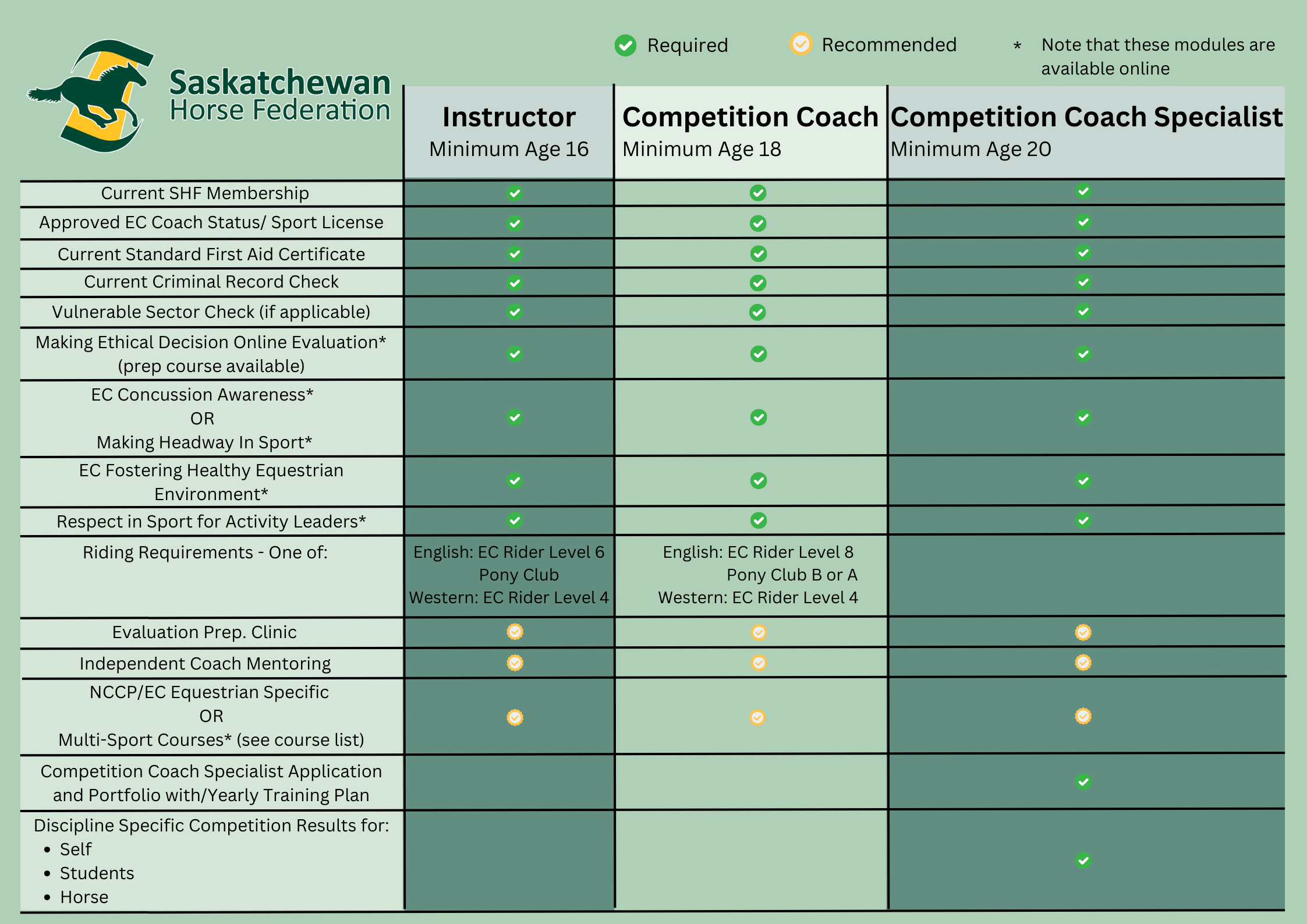 As the National Coaching Certification Program (NCCP) partner for equestrian sport and activity, EC is responsible for leading program development, establishing minimum standards and ensuring consistent and effective delivery across Canada in partnership with the Provincial/Territory Sport Offices (PTSO) - For Saskatchewan this would be the Saskatchewan Horse Federation.